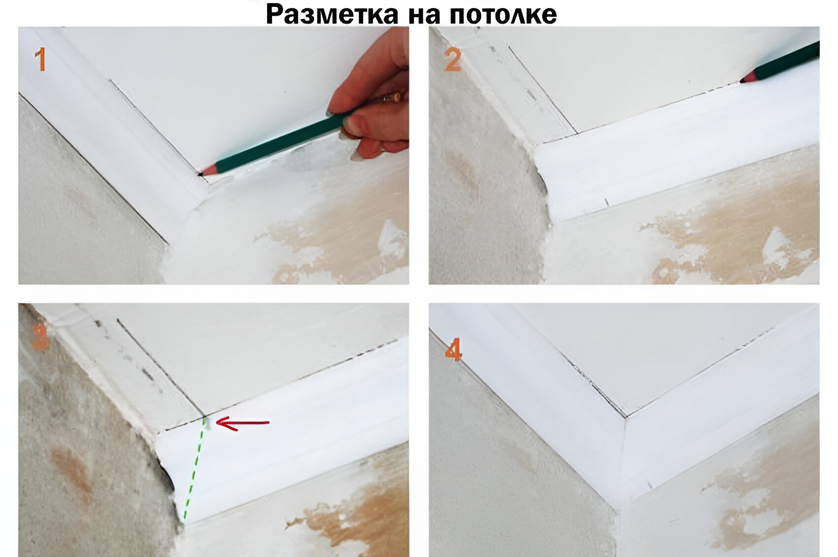 2- Проводим линию из точки пересечения на потолке, к точке пересечения на стене